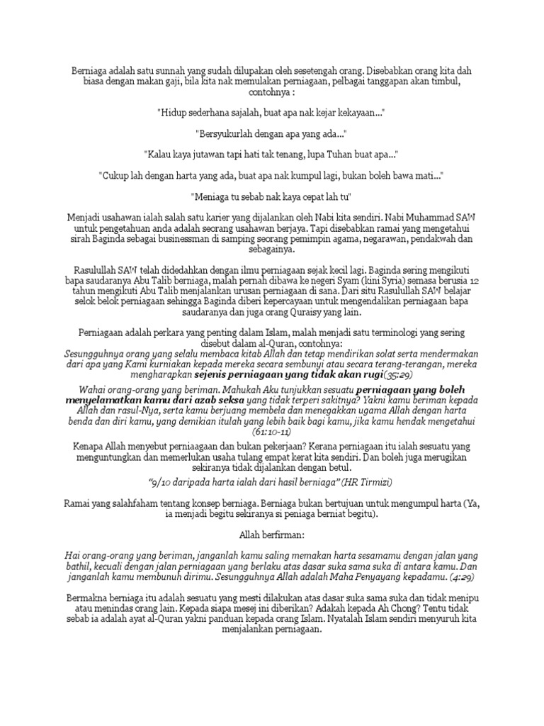 Zaman nabi sendiri banyak yang berniaga dan menjadi usahawan yang berjaya hebat. Anda sahaja yang boleh membantu diri anda untuk bermula. Ada sebuah hadits yang sering tersebar di kalangan orang awam sebagai motivasi untuk berbisnis atau menjadi pedagang.
