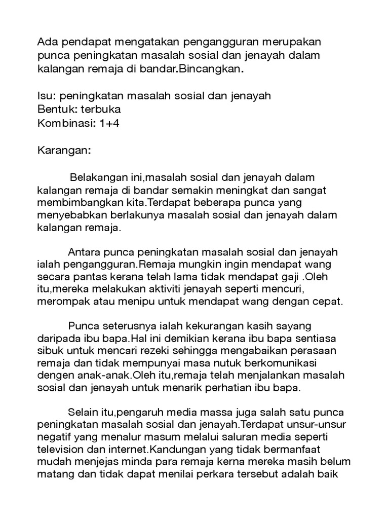 Karangan Masalah Sosial Dalam Kalangan Remaja Punca Kesan dan Langkah-Langkah Masalah sosial dalam kalangan remaja merupakan fenomena yang semakin membimbangkan kita pada hari ini. Gejala sosial sering berlaku di kalangan remaja yang berumur antara 10 hingga 18 tahun. Punca-punca berlakunya masalah sosial.
